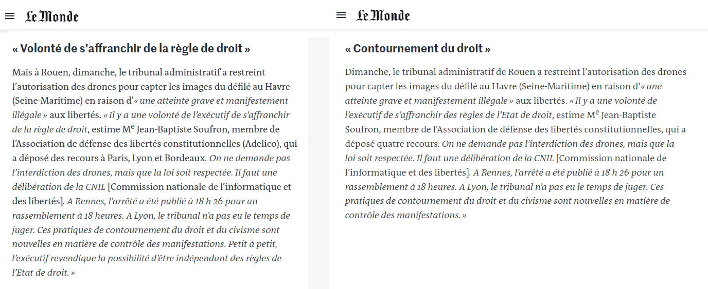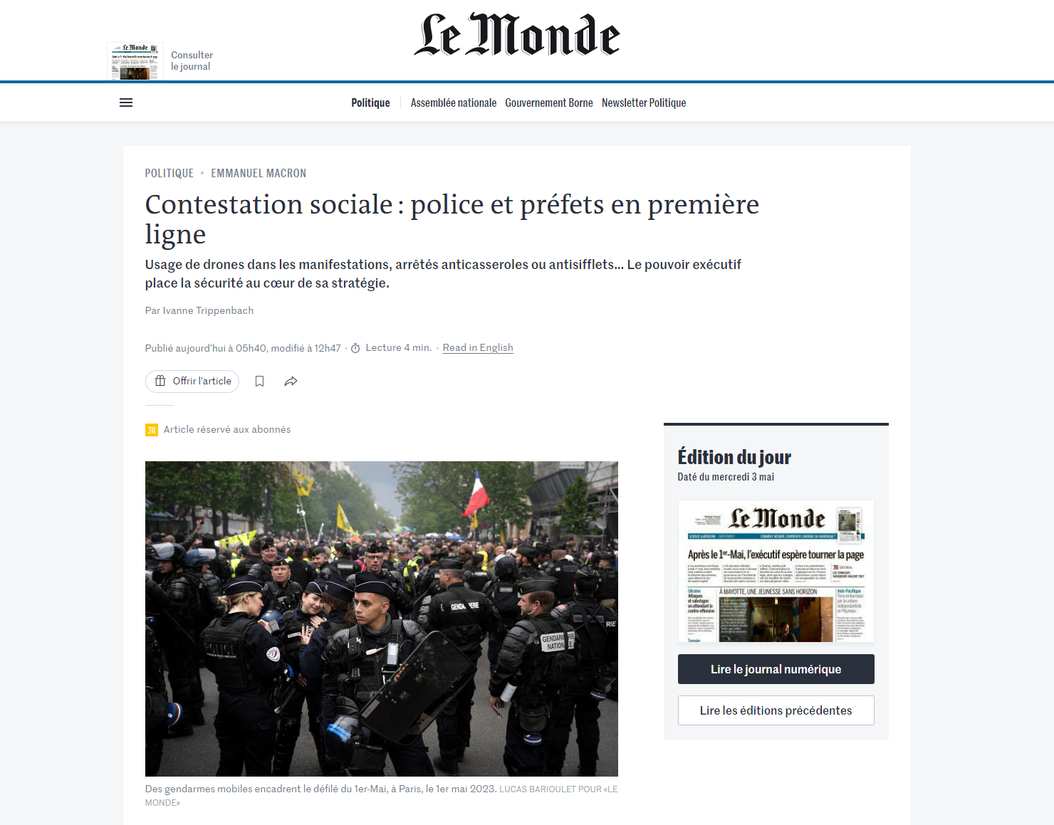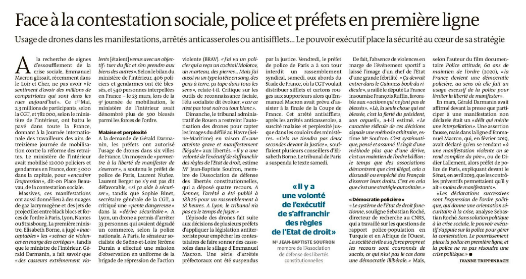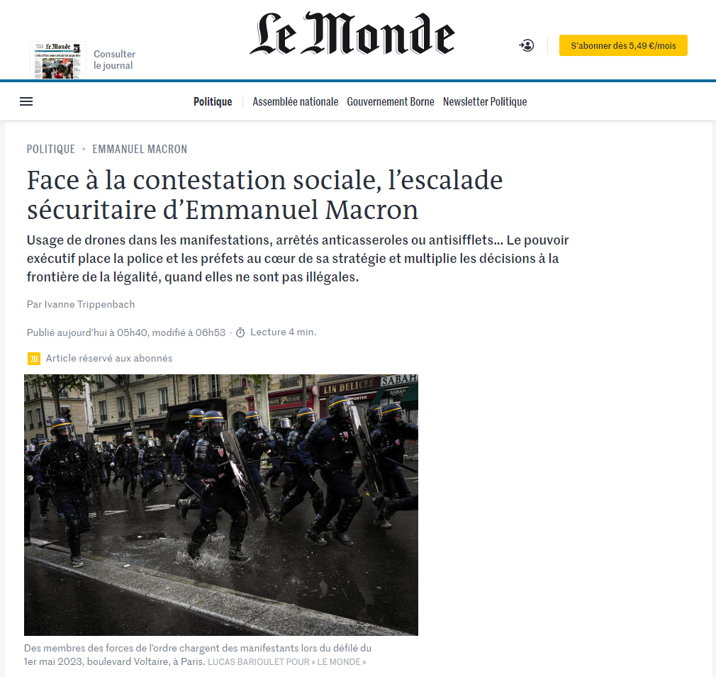... Le sous-titre de l'article ne mâche pas ses mots : "Usage de drones dans les manifestations, arrêtés anticasseroles ou antisifflets… Le pouvoir exécutif place la police et les préfets au cœur de sa stratégie et multiplie les décisions à la frontière de la légalité, quand elles ne sont pas illégales."