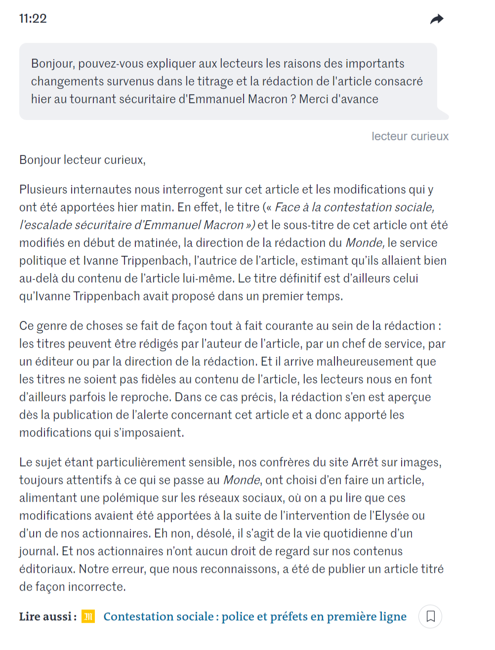 : "Pouvez-vous expliquer aux lecteurs les raisons des importants changements survenus dans le titrage et la rédaction de l'article consacré hier au tournant sécuritaire d'Emmanuel Macron ?"