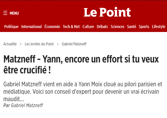 Plus récemment, c'est Yann Moix qui a eu les honneur de sa prose. A l'occasion de la polémique qui a secoué la rentrée littéraire, à propos de la réapparition de textes et dessins antisémites, Matzneff vole au secours de son confrère, l'invitant ironiquement a faire "encore un effort [s'il veut] être crucifié"