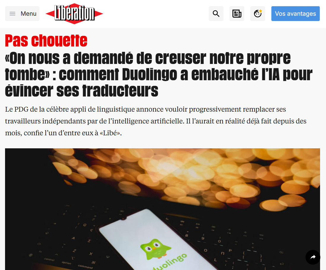Ce mois de mai a été marqué par une gigantesque polémique concernant la célèbre application d'apprentissage des langues Duolingo. Son patron a en effet annoncé fin avril que l'IA dominerait désormais tous les aspects de son business, y compris celui des traductions, cœur même de son rapport avec ses millions d'utilisateurs et d'utilisatrices à travers le monde. Une annonce qui masque le fait qu'en réalité, le basculement a été enclenché il y a déjà plusieurs mois, les travailleurs et travailleuses indépendant·s réalisant les traductions et le parcours linguistique de l'application ayant été mis sur le carreau après avoir entraîné les IA, a révélé le 1er mai une enquête approfondie de Libération.