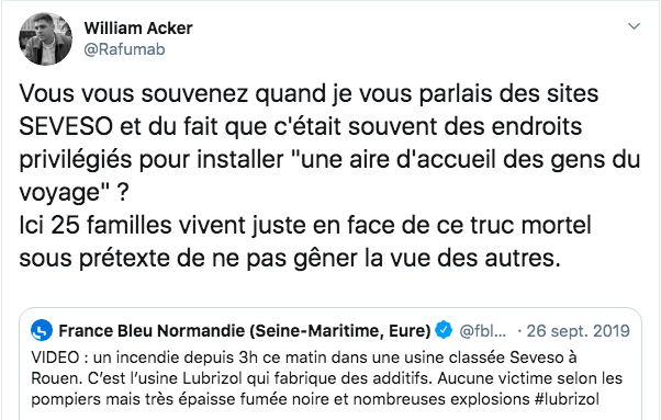 William Acker : - Ce jour-là, pendant que l'usine brûlait, je me suis dit, tiens, c'est une usine Seveso, il y a peut-être une aire d'accueil à côté. J'ai pris l'ordi, regardé le schéma départemental d'urbanisme, et je l'ai vue, tout près, à moins de 500 mètres. J'ai tout de suite appelé Lise Foisneau et le photographe Valentin Merlin avec qui elle travaille, puis nous avons appelé la mairie de Petit-Quevilly, la préfecture, la métropole. On ne nous disait rien, alors finalement je me suis fait passer pour le fils d'un des résidents et j'ai appris qu'ils n'avaient pas été évacués. Ils étaient confinés dans leur caravane, personne ne s'en préoccupait. J'ai alors commencé une longue série de tweets sur Lubrizol. Lise et Valentin sont partis sur place et ont commencé à produire des vidéos sur la situation, que je twittais.