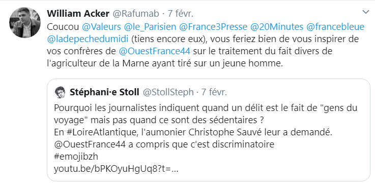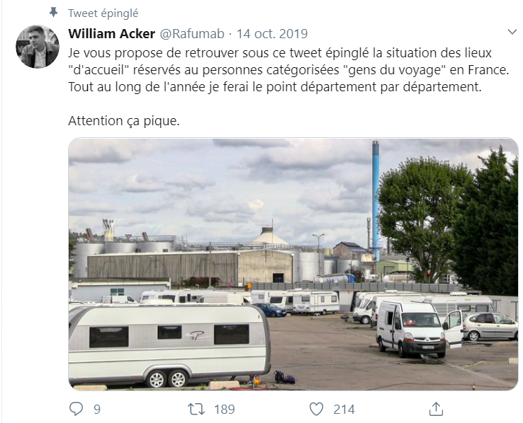 William Acker : - Je veux sensibiliser l'opinion, donc je m'adresse d'abord aux journalistes, aux politiques, aux gens du milieu culturel, très présents sur Twitter ; je fais tache sur ce réseau, donc on me voit (rires). Et puis je critique parfois la presse régionale pour des articles où les gens du voyage sont injustement pointés du doigt, et Twitter est un bon endroit pour ça. Enfin je publie des threads qui sont repérés par des médias. Par exemple, Mediapart