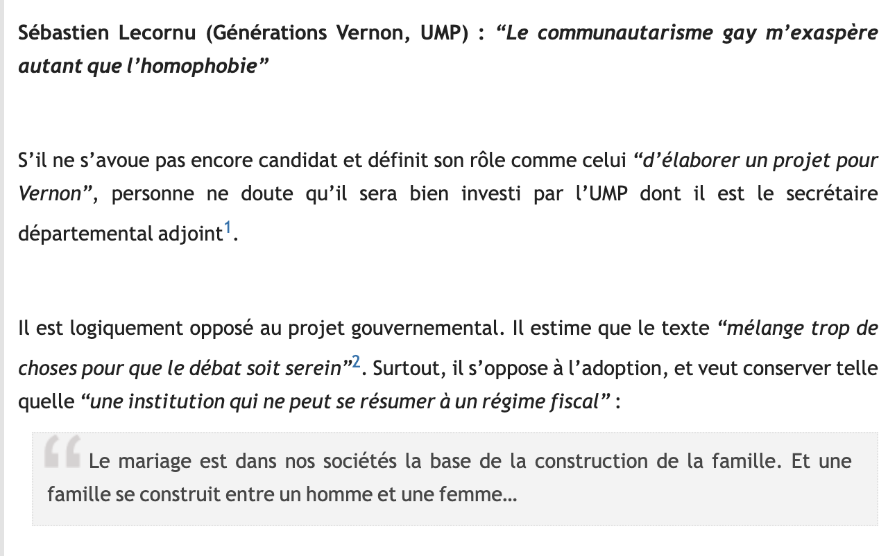 Sébastien Lecornu a raison en indiquant qu'il était "jeune candidat". Mais il était aussi déjà un politique chevronné, ayant débuté comme assistant parlementaire dès 16 ans : il choisissait déjà soigneusement les termes qu'il employait, et je réponds de ma propre retranscription. Quant au pourquoi son opposition de l'époque au Mariage pour tous, la réponse est peut-être dans cet article du Poulpe contant par le menu l'influence politique, dans Vernon, d'une communauté catholique fervente. Communauté qui, en 2014, vota… Lecornu. CQFD.