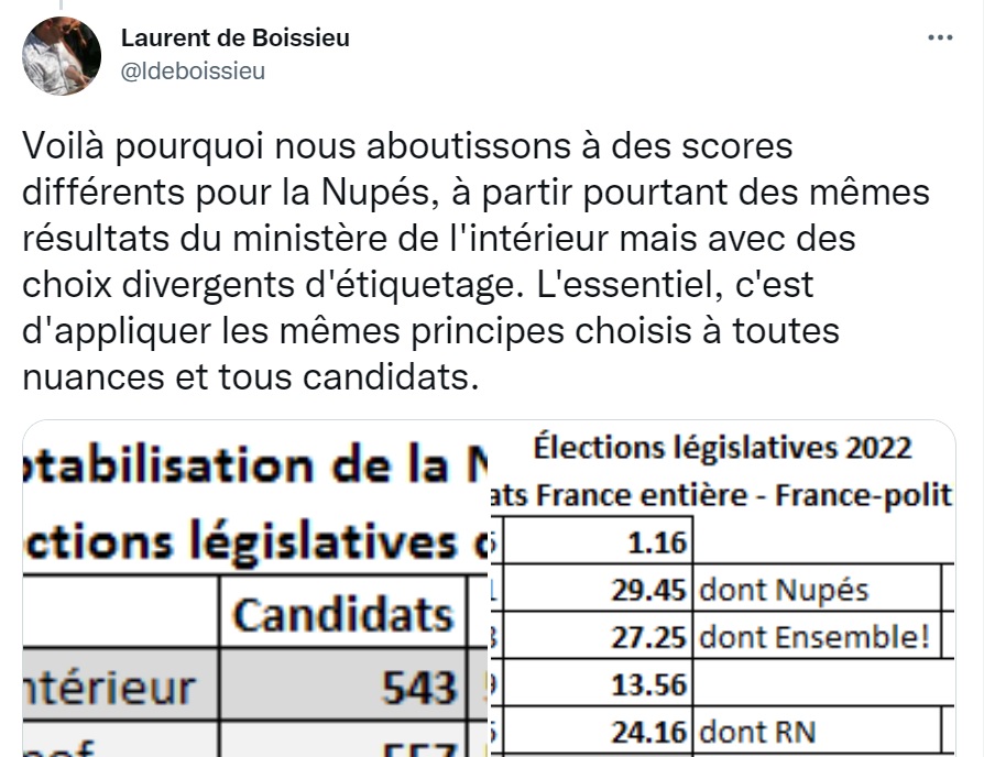Pour complexifier encore un peu la chose, Laurent de Boissieu, journaliste politique à la Croix et spécialiste des questions électorales, a lui aussi effectué son propre décompte, comme il le fait à chaque élection. Et ses résultats diffèrent de ceux de Manuel Bompard, de ceux du ministère, ainsi que de ceux du Monde et du Cevipof. Selon le journaliste, qui a posté ses résultats sur son compte Twitter, la coalition présidentielle arriverait en tête avec 25,89 % des voix, juste devant la Nupes avec 25,80 % des voix. Toujours serré donc, mais pas dans le même ordre. Et là encore, ce sont les Outre-Mer qui posent problème à Laurent de Boissieu. "Officiellement, les Outre-Mer n'étaient pas dans la coalition Nupes, explique-t-il à ASI. Est-ce qu'on inclut dans les scores de la Nupes les candidats appartenant à des formations qui composent la Nupes ? Est-ce qu'on inclut tout le monde dans la Nupes ou est-ce qu'on s'en tient à ceux qui ont l'investiture ? Le Monde et le Cevipof font le choix d'inclure tous ceux qui font partie de la composante. Moi je m'en tiens aux investitures Nupes."