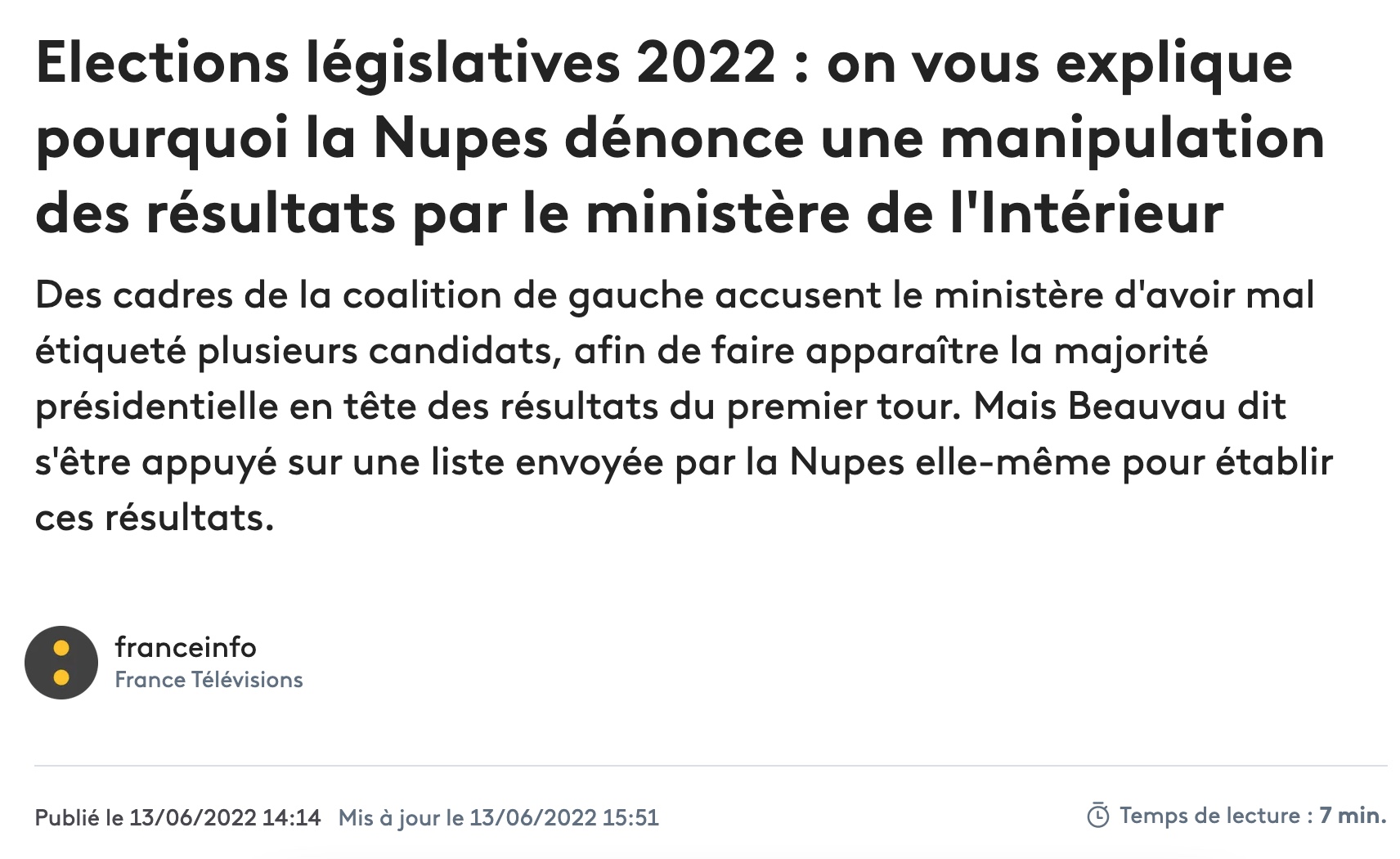 Le ministère arguait alors que la Nupes n'avait aucune existence légale : un argumentaire repris sans vraiment de remise en question dans un article doublé d'une vidéo de fact-checking réalisés par la rubrique Fake Off de 20 Minutes et relayés par l'AFP dans le cadre de la "coalition Objectif Désinfox" (coordonnée par l'AFP, financée par Google, dans le cadre des élections présidentielle et législatives). C'est finalement le Conseil d'État qui a dû s'y coller. Dans une décision rendue le 7 juin, l'institution tranche : "La Nupes rassemble les principaux partis et formations politiques de gauche autour d'un programme partagé et de candidatures uniques dans l'ensemble des circonscriptions. […] Comptabiliser les partis politiques de cette coalition séparément peut porter atteinte à la sincérité de la présentation des résultats électoraux."