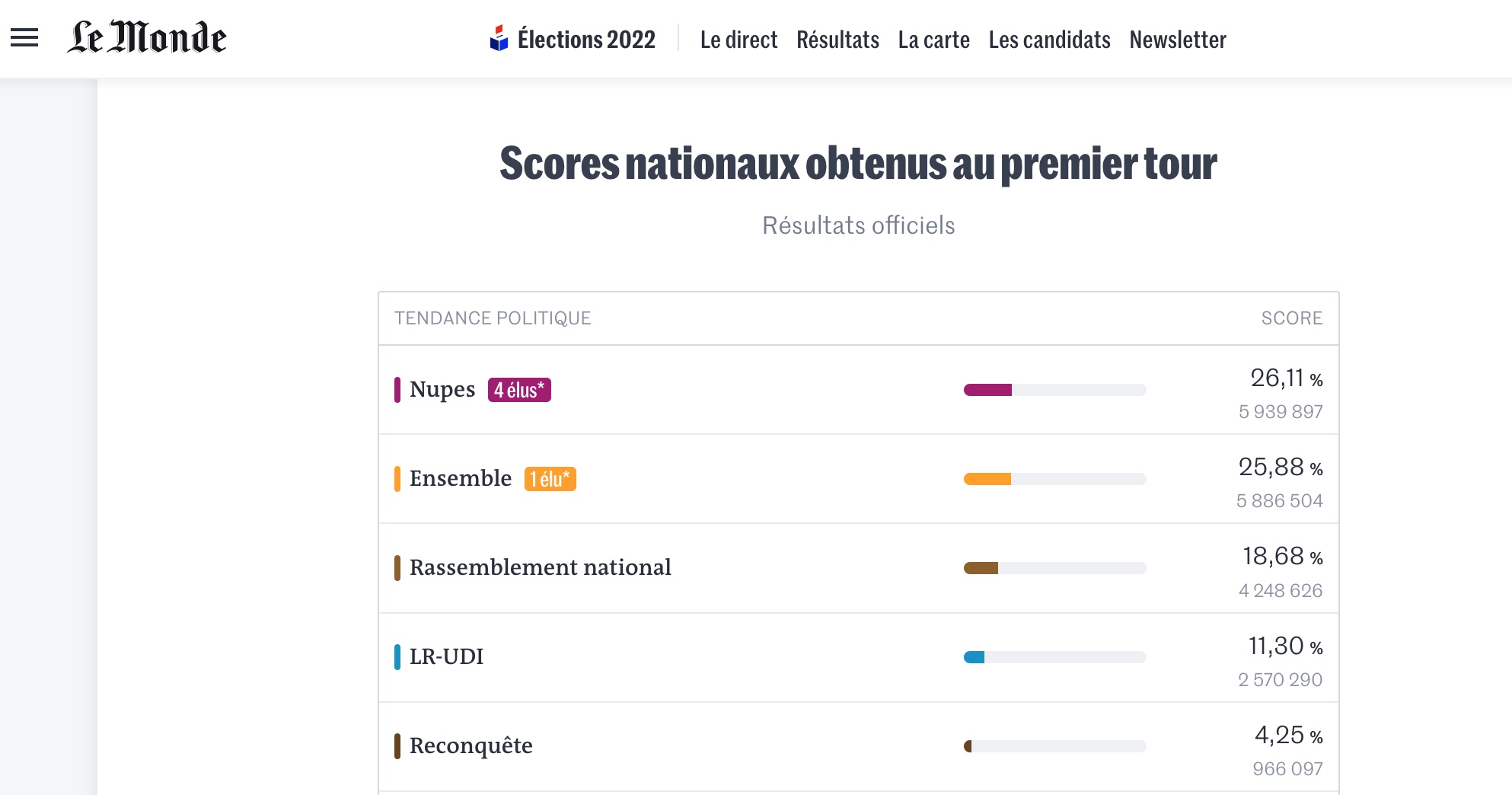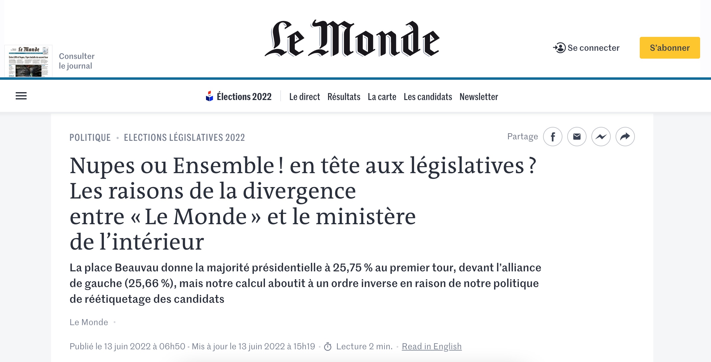 Résultat : un décompte tellement complexe qu'il en existe un troisième, qui donne encore d'autres résultats différents de ceux du ministère et de ceux avancés par Manuel Bompard (il en existe même un quatrième, voir plus bas). Le Monde est à notre connaissance le seul média français à avoir fabriqué son propre système de comptage, qui donne des résultats sensiblement différents : la Nupes arriverait en tête avec 26,11 % des voix devant Ensemble ! qui totaliserait 25,88 % des suffrages. Un décompte réalisé par les journalistes du quotidien avec l'aide du Cevipof, le centre de recherche politique de Sciences Po, et d'un consortium d'une trentaine de chercheurs venus de toute la France.