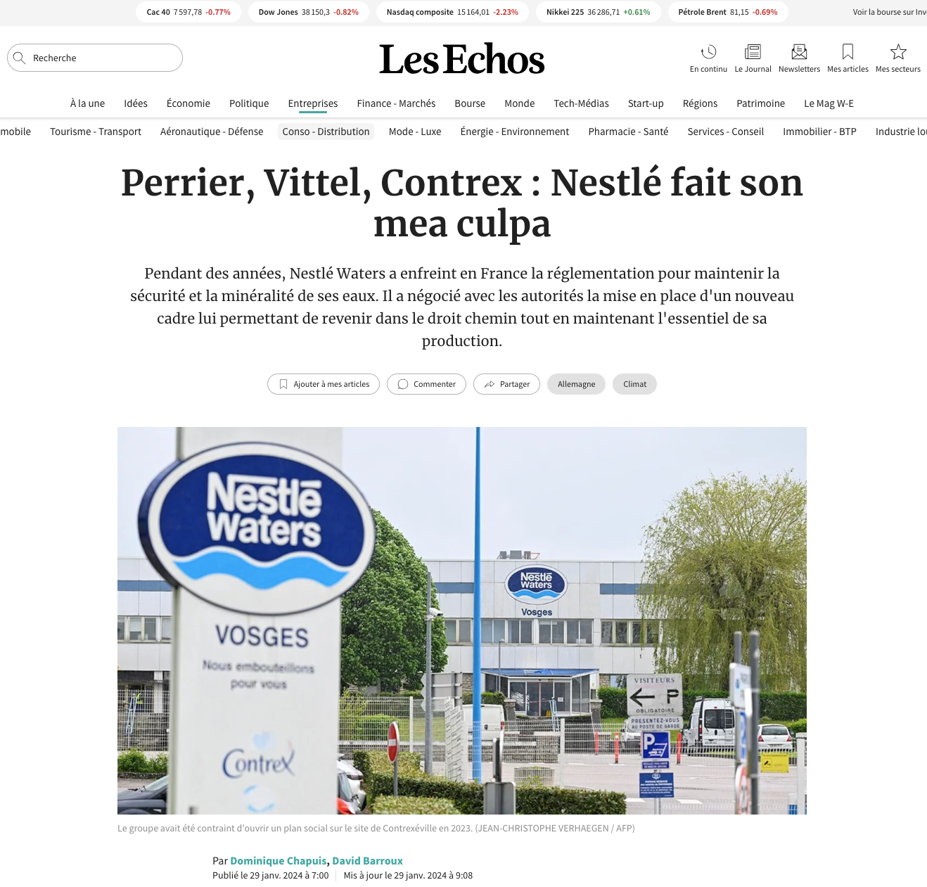 Les "Échos" : Nestlé Waters tente de diluer le scandale