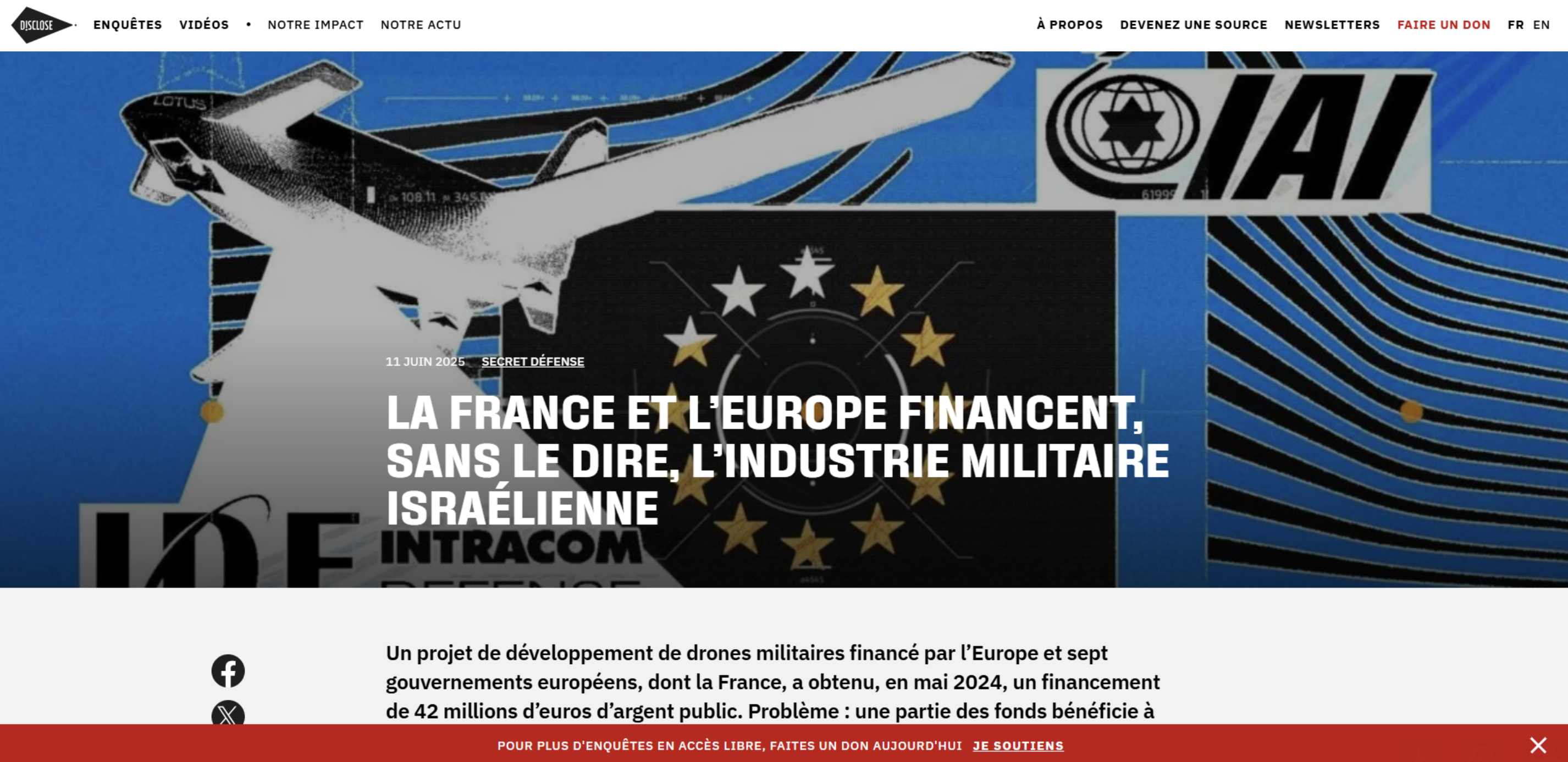 En juin 2025, le média d'investigation Disclose avait révélé que la société IAI était "au coeur de l'opération militaire déclenchée à Gaza après le 7-Octobre 2023. L'armée Tsahal utilise notamment ses drones Héron pour surveiller, cibler et frapper des bâtiments et campements où sont des réfugié·es civil·es palestinien·nes". Enfin, parmi les partenaires de la Fondation France-Israël tels que renseignés sur son site internet, on trouve le Fonds national juif, KKL, une agence israélienne créée en 1901, accusée de participer à l'expropriation des terres aux Palestiniens en Cisjordanie ou encore Elnet, un lobby pro-Israélien.