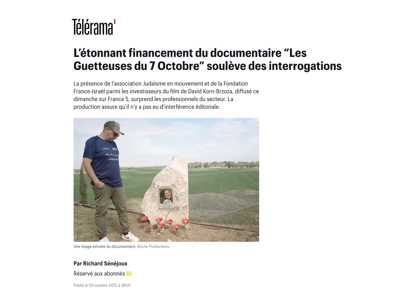 Contactée plusieurs fois par Arrêt sur images, Dominique Tibi a répondu, par écrit, après la publication de cet article. La productrice indique : "Les Guetteuses du 7 Octobre est un film ancré dans un devoir de mémoire et d’information, et en aucun cas un objet politique. C’est dans cet esprit que Roche Productions l’a accompagné, avec la même exigence d’indépendance et de transparence qui guide tous ses projets."