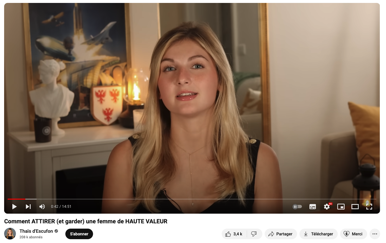 "Les femmes modernes sont plus préoccupées par leur apparence que par leurs devoirs. Le premier d'entre eux consiste à trouver un homme de valeur avec qui fonder un foyer" : cette phrase ne provient pas d'une vidéo INA des années 1950, ni d'un coach en séduction, mais bien d'une femme, Thaïs d'Escufon. La jeune militante, ex-porte parole du groupuscule Génération Identitaire, dissous en 2021, partage ses "conseils" aux jeunes hommes pour trouver une femme "de valeur", et n'hésite pas au passage à taper sur les mouvements féministes. Elle n'est pas la seule : depuis plusieurs années, sur TikTok, Instagram ou YouTube, de nombreuses femmes de droite et d'extrême droite ont fait de l'antiféminisme leur fond de commerce.