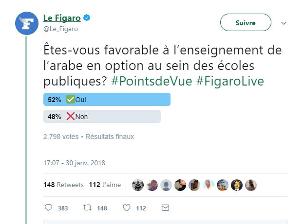 C'est un sondage publié sur le compte Twitter du Figaro. La question : "Etes-vous favorable à l’enseignement de l’arabe en option au sein des écoles publiques ?". Le "oui" en est sorti majoritaire à 52%, contre 48% d’avis défavorables.