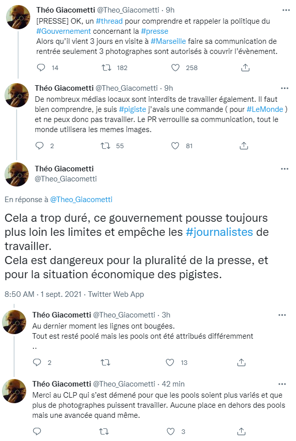 Giacometti abonde : la conférence de presse prévue à Marseille le 2 septembre après-midi, près de la plage du Prado - en extérieur, donc - n'avait, par exemple, nul besoin d'être "poolée", selon lui. "Il y a de la place, donc aucune raison d'empêcher les photographes de venir. Et pourtant, tout est poolé. Les collègues qui sont photographes indépendants ne peuvent rien faire du tout."