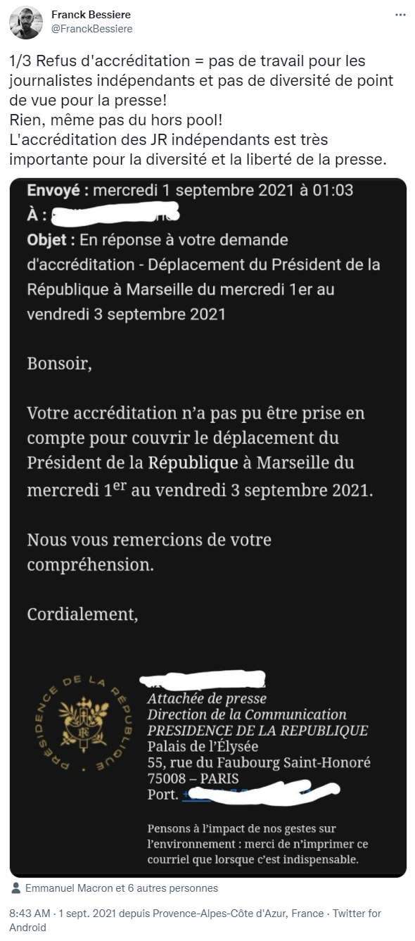 Franck Bessière, photojournaliste indépendant basé à Toulon, avait lui aussi prévu de couvrir le déplacement de Macron à Marseille. Mais quelques heures avant l'arrivée du président sur la côte, Bessière a appris que son accréditation avait été rejetée. "Rien, même pas hors du pool !"