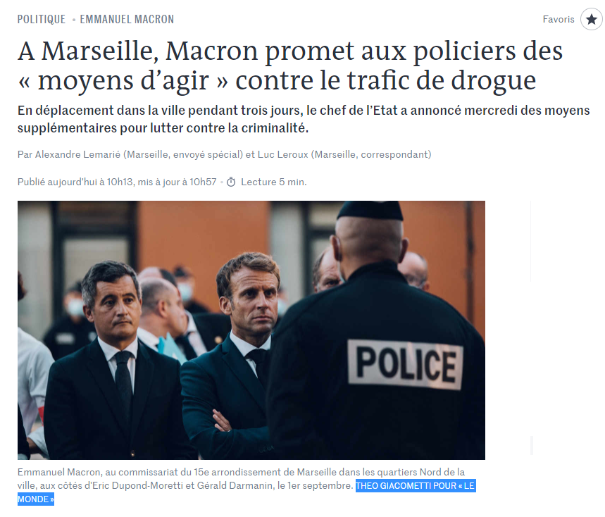 Le président Macron serait-il obsédé par le contrôle de son image ? Ce 1er septembre, jour d'arrivée présidentielle dans la cité phocéenne, le photojournaliste marseillais Théo Giacometti, accrédité par Le Monde pour couvrir la visite de Macron, pousse une gueulante sur Twitter contre le "pool" de photographes prévu : "Seulement trois photojournalistes sont autorisés à couvrir l'événement. (...) Le président verrouille sa communication, tout le monde utilisera les mêmes images." Il s'inquiète pour la liberté de la presse, sous ce gouvernement qui "pousse toujours plus loin les limites et empêche les journalistes de travailler".