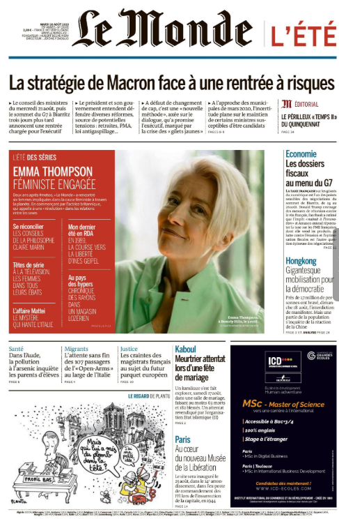 Vacances "studieuses" pour rentrée "périlleuse". Voilà ce que les télés retiennent de l'été d'Emmanuel Macron et surtout de la rentrée politique qui s'annonce. Et les présentateurs et éditorialistes d’égrener les "embûches" qui attendent le chef de l'Etat et le gouvernement : réforme des retraites, de l'assurance chômage, projet de loi bioéthique, débat parlementaire sur l'immigration... Autant de dossiers qui rendent "chargée", "brûlante", "explosive", "à risques" la rentrée politique.