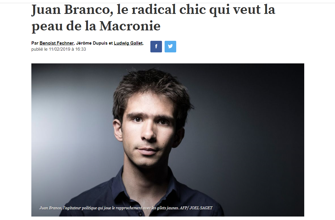 "Entreprise de démolition", "salissure". Juan Branco ne décolère pas. L’avocat et activiste multi-casquettes n’a pas de mot assez durs contre L’Express. En cause ? Un long portrait publié par l’hebdo ce 11 février et titré "Juan Branco, le radical chic qui veut la peau de la Macronie". L’article raconte, anecdotes assassines à l'appui, le parcours de "cet avocat bien né" qui "à force de se radicaliser" est devenu "un temps l’avocat de Mélenchon", et s’est ensuite "rapproché des Gilets jaunes". Pourfendeur de la Macronie et ardent défenseur des Gilets jaunes, Branco y est présenté comme ayant "pourtant peu en commun avec ces nouveaux camarades."