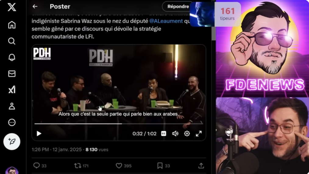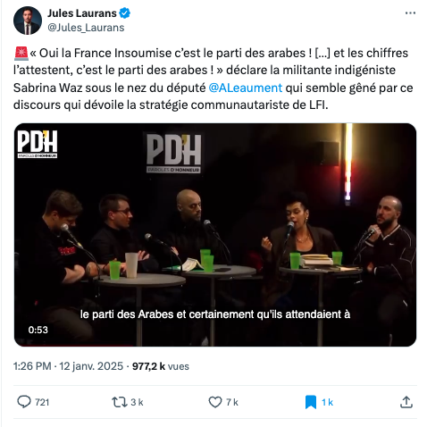 Mais ce sont surtout les médias d'extrême droite qui se jettent sur la séquence virale. "« Oui, La France insoumise est le parti des Arabes ! » : l'analyse choc d'une journaliste «décoloniale» provoque des remous sur X",