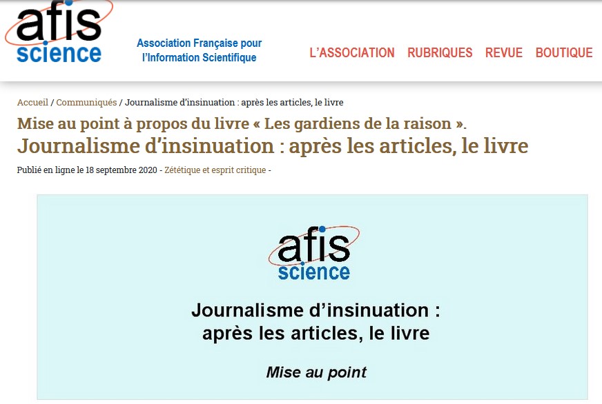 , Thomas Durand répond aux attaques du livre - "(...) la même salade que l’article absurde de Bruno Andreotti (...) essentiellement des anecdotes, une litanie de faits (en mode cherry picking) et de procès d’intentions" - dont il fait l'objet. "Sur certains aspects, le texte se distingue tellement peu des élucubrations complotistes dirigées contre notre travail quotidiennement depuis 5 ans, qu’il sera sans nul doute salué par les plus virulents de nos détracteurs (...) On est dans le quasi-factuel, le superficiel et le mépris suintant. C’est le climat général de l’ouvrage. (...) Du journalisme d’insinuation. Je suis bien obligé de constater que les auteurs se livrent à une tromperie de leur lectorat et à une insulte à caractère diffamatoire de notre travail." Une nouvelle pièce dans le manège à shitstorm. Contactés par ASI, les trois auteurs répondent que "la bulle zététique 2.0 [...] fonctionne très exactement suivant ce que l’on décrit dans le livre. Dans la