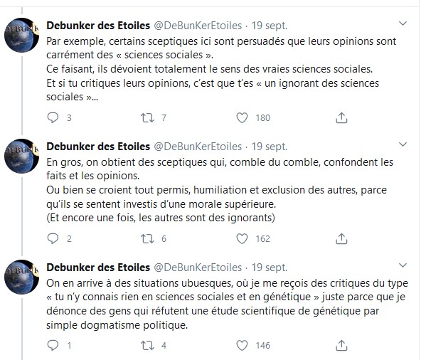 la voix de la Science qui parle. Et qu’on se doit de l’écouter." Eux aussi semblent touchés par cette atmosphère délétère. Mathieu Rebeaud a quitté temporairement Twitter. Le 19 septembre, une autre tête d'affiche de la communauté, Debunker des Étoiles, dressait un constat amer de son activité sur le réseau et envisageait de "[se] faire un peu oublier pour un temps". Mais tout est prétexte à raviver l'incendie. Y compris une proposition de