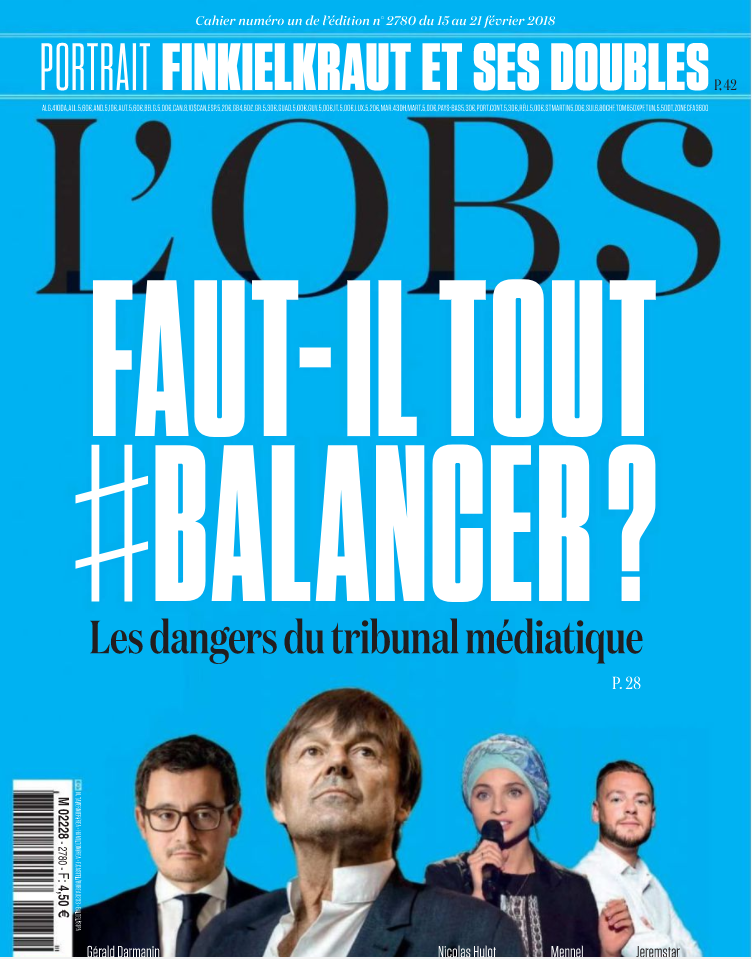 C'est avec une certaine inquiétude que L'Obs s'interroge cette semaine sur les risques que comporterait la révélation d'affaires volontairement portées dans les médias par des accusateurs.trices, faisant passer la case justice au second plan. A grand renfort de philosophes, d'avocats et de journalistes, l'hebdomadaire alerte sur la possibilité d'une "société où les victimes n'iront plus saisir la justice mais commenceront par balancer".