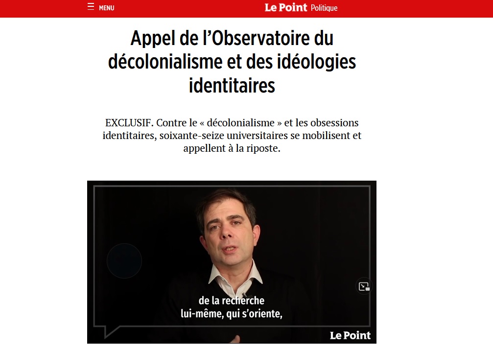 du monde venues des États-Unis. Au début, le travail de cet "observatoire" a intrigué, puis il a fait rire, et il suscite maintenant un certain accablement d'une partie des chercheurs en sciences sociales. Alors, qu'est-ce que l'Observatoire du décolonialisme, qu'apprécient tant, depuis quelques mois Le Point, Le Figaro ou Valeurs Actuelles ?