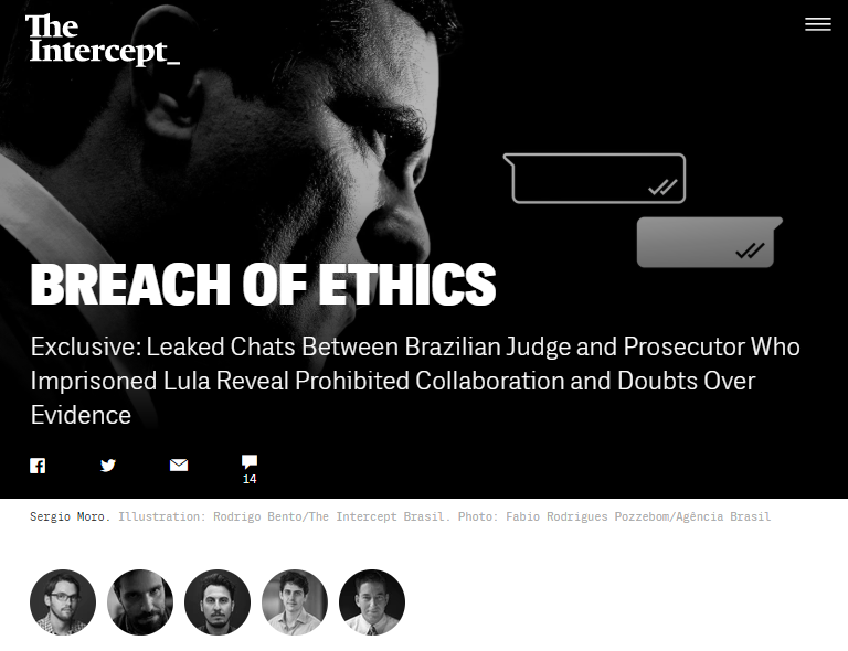 . Le site fondé par le journaliste Glenn Greenwald accuse le juge qui a condamné Luiz Ignacio "Lula" da Silva pour corruption, et les procureurs en charge du dossier dans le cadre de la très vaste enquête de corruption "Lava Jato" ("Lavage express"), d'avoir "collaboré illégalement