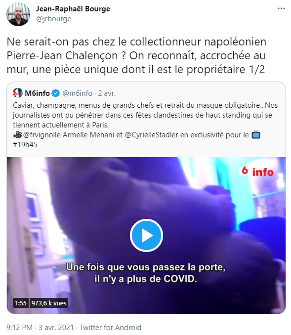 M6 indique que le restaurant clandestin se situe "dans les beaux quartiers", mais le vrai indice se situe plus loin dans le sujet, autour de 1'20". Les images filmées par des convives huppés chez l'organisateur de la soirée privée capturent un décor fastueux, tout en dorures et en meubles de luxe. Un détail attire le regard : une immense tapisserie à l'effigie de Napoléon Bonaparte. Cela n'a pas échappé à notre journaliste Paul Aveline, ni d'ailleurs à plusieurs internautes, qui se demandent sur Twitter ce 3 avril si on ne serait pas "chez le collectionneur napoléonien Pierre-Jean Chalençon" : "On reconnaît, accrochée au mur, une pièce unique dont il est le propriétaire."