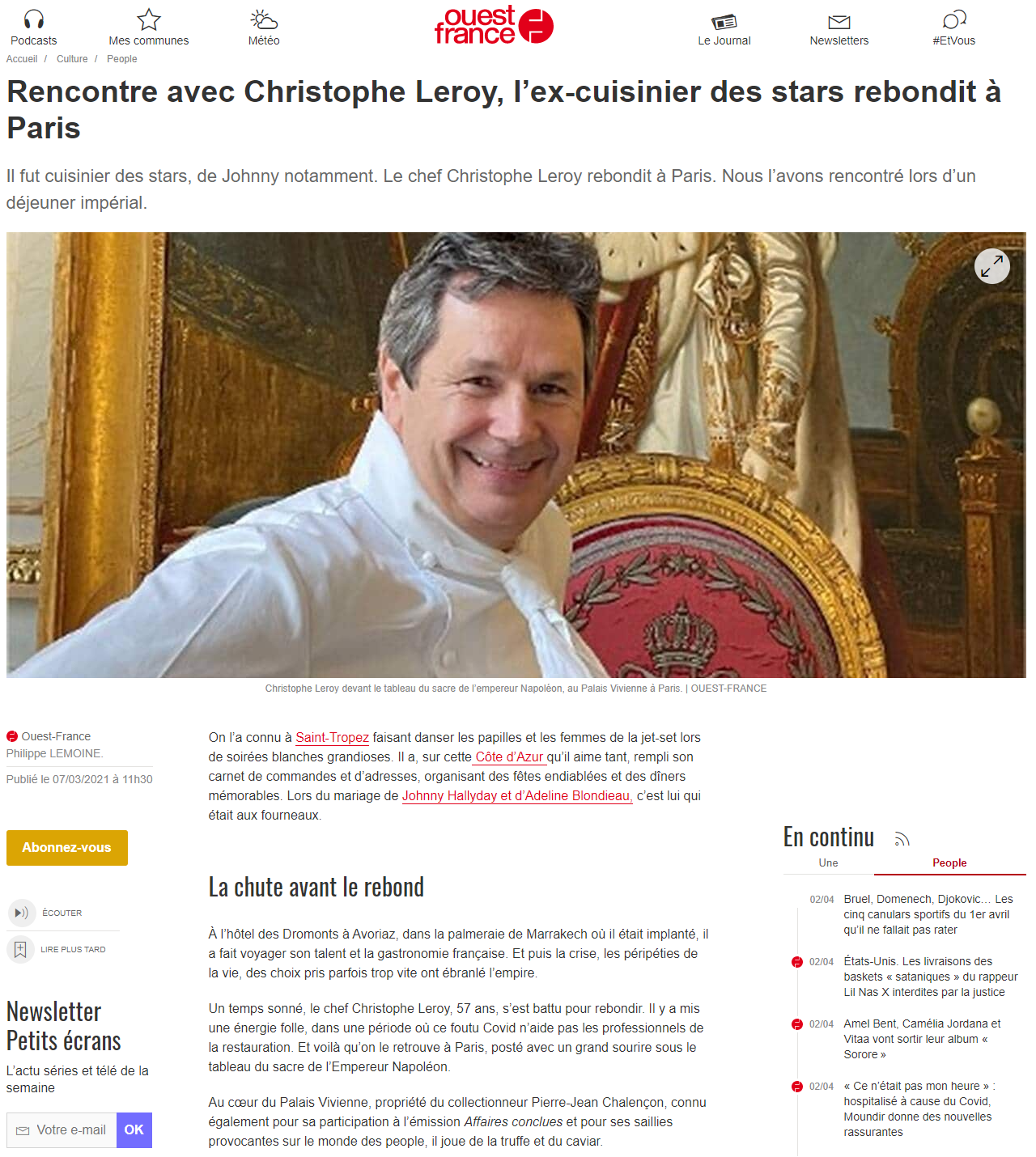 L'article d'Ouest-France, signé Philippe Lemoine, rédacteur en chef délégué du quotidien, ne précise pas si les conditions du "déjeuner impérial" se déroulent avec ou sans gestes barrières - ni que les (autres) restaurants sont fermés depuis des mois. Mais l'on y apprend que "le chef Christophe Leroy, 57 ans, s’est battu pour rebondir (...) dans une période où ce foutu Covid n’aide pas les professionnels de la restauration" et que désormais installé "au cœur du Palais Vivienne, propriété du collectionneur Pierre-Jean Chalençon (...) il joue de la truffe et du caviar." Leroy explique à Ouest-France
