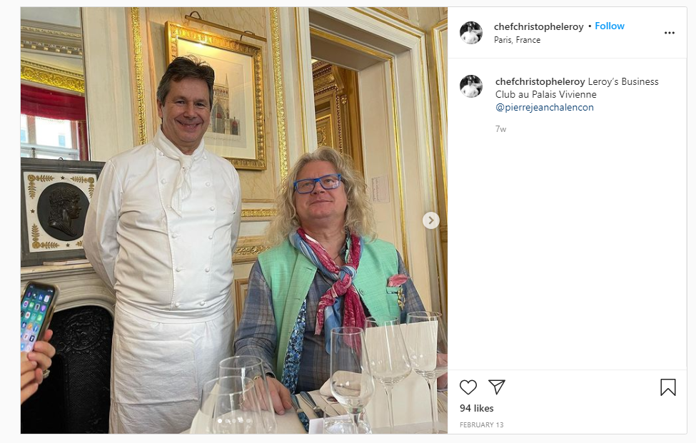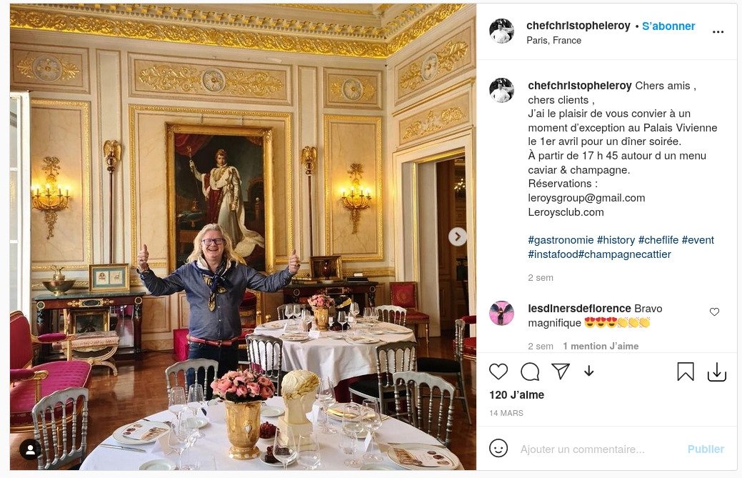Chalençon ne cache d'ailleurs pas son soutien aux restaurateurs, puisqu'il met à disposition sa propriété du 8e arrondissement de Paris, le Palais Vivienne - jusqu'à la pandémie, un musée ouvert au public - pour accueillir des chefs en ces temps difficiles. On peut en toute bonne foi supposer que c'est ainsi qu'il se retrouve sur une photo sur Instagram du chef Christophe Leroy, qui invite ses amis et ses clients "à un moment d'exception au Palais Vivienne le 1er avril pour un dîner-soirée, à partir de 17h45 autour d'un menu caviar et champagne" :