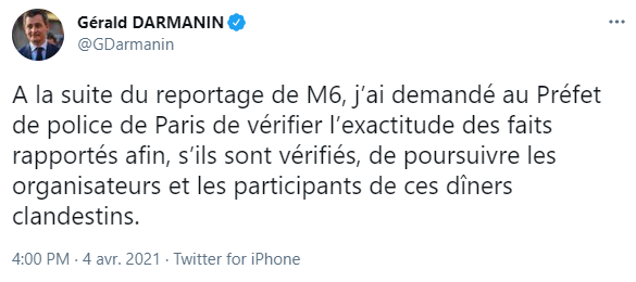 Dimanche 4 avril dans l'après-midi, le ministre de l'Intérieur Gérald Darmanin a également réagi en annonçant avoir "demandé au Préfet de police de Paris de vérifier l'exactitude des faits rapportés afin, s'ils sont vérifiés, de poursuivre les organisateurs et les participants de ces dîners clandestins."