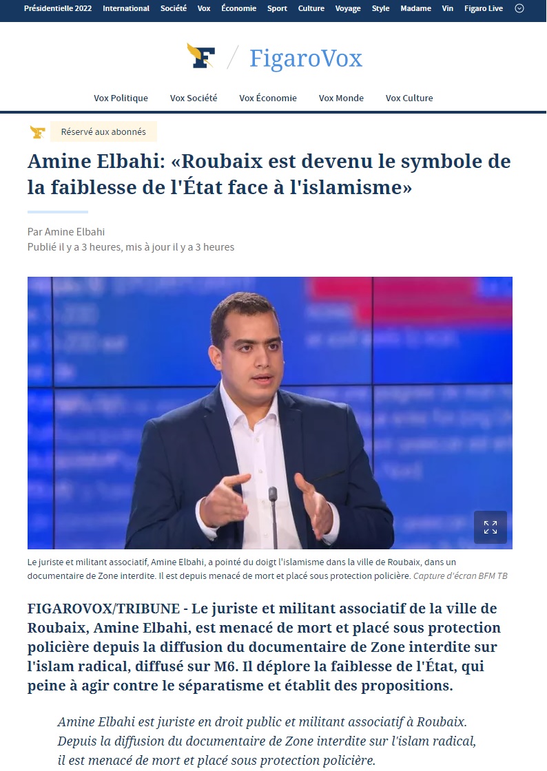 Elbahi y écrit que "Roubaix est devenu le symbole de la faiblesse de l'État face à l'islamisme"