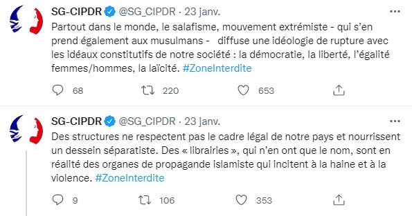 Et ce 23 janvier, jour de diffusion, la machine de com' est en marche. Le Comité interministériel de prévention de la radicalisation et du séparatisme (SG-CIPDR) tweete ainsi, avec le hashtag #ZoneInterdite : "