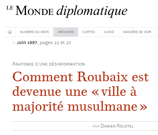 . "Partant de ce postulat (Roubaix, ville de France où les musulmans sont majoritaires), [un éditorial] donne le ton du dossier : le combat s'impose contre les intégristes qui saperaient la République,"