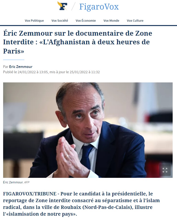 Ce 23 janvier, Éric Zemmour semblait saliver devant sa télévision. Sur son compte Twitter, pas moins de six tweets ont été postés sous le hashtag #ZoneInterdite, dont un extrait de l'émission à Roubaix, qualifiée d'"Afghanistan à deux heures de Paris"
