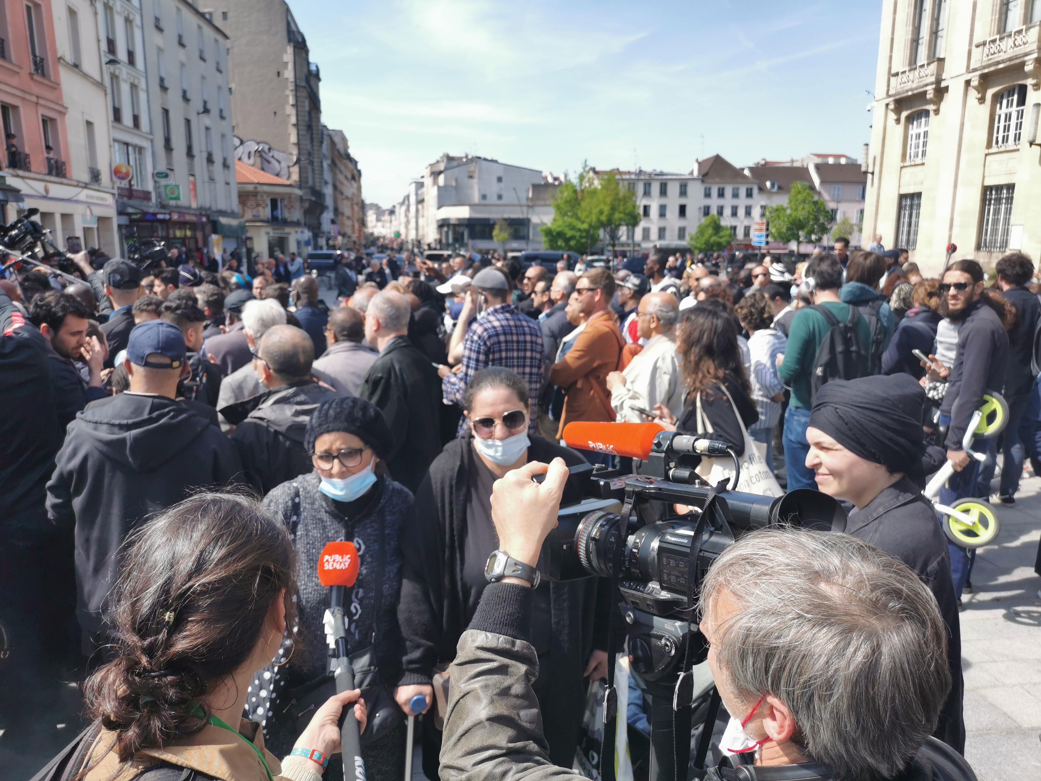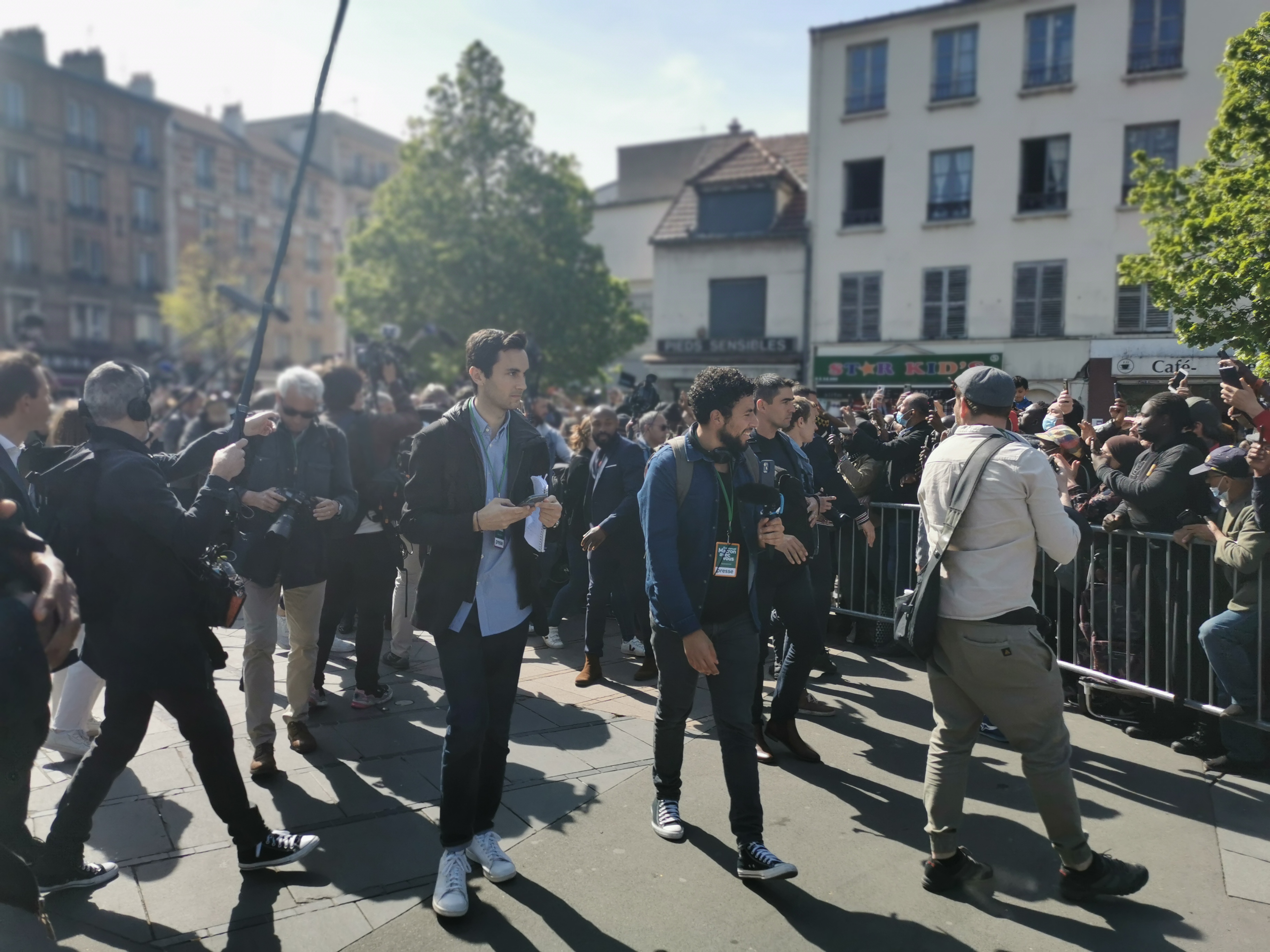 Après plus d'une heure, la barrière s'ouvre pour les journalistes : c'est l'heure du "micro tendu" aux questions des journalistes, qui se passera au beau milieu de la place de la mairie, à équidistance entre les barrières côté basilique et côté rue de la République, hors de portée des habitants qui continuent d'appeler le président-candidat – et les journalistes – à se tourner vers eux.