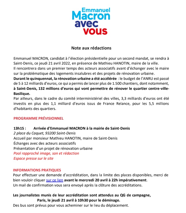 car déjà sur place, j'écris à l'équipe de Macron le 21 avril au matin : "Hélas, les accréditations sont closes depuis hier 22h..."