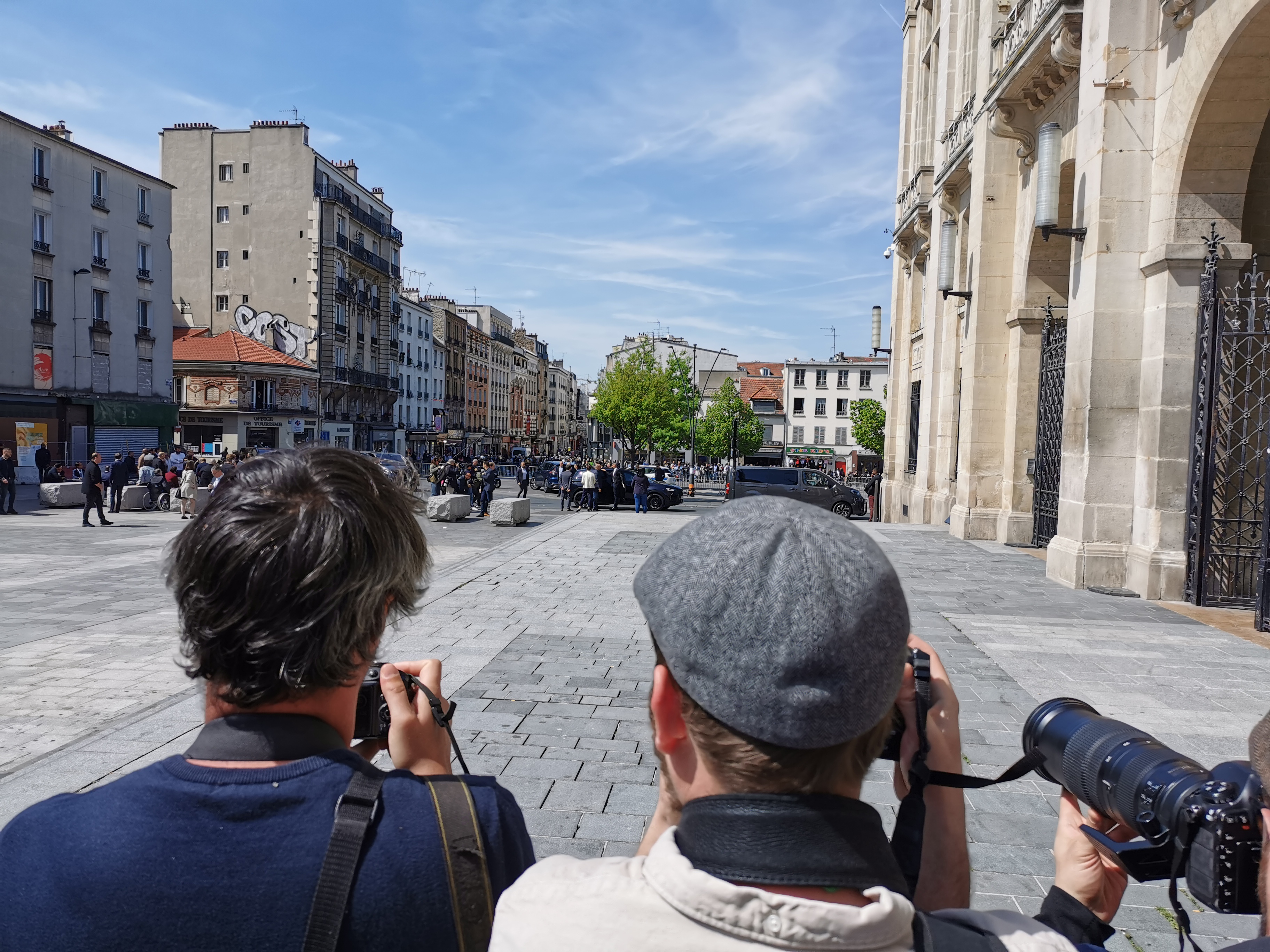 Tout le périmètre a été bouclé par l'équipe de campagne. La mairie de Saint-Denis donne directement sur le parvis de la basilique, où s'étendent les terrasses des cafés, et sur la place du marché, où débute la rue de la République, plus populaire et commerçante. La zone réservée au candidat et à sa garde rapprochée fait une centaine de mètres carrés et s'étend de la rue d'où est arrivé son véhicule blindé jusqu'aux abords de la mairie.