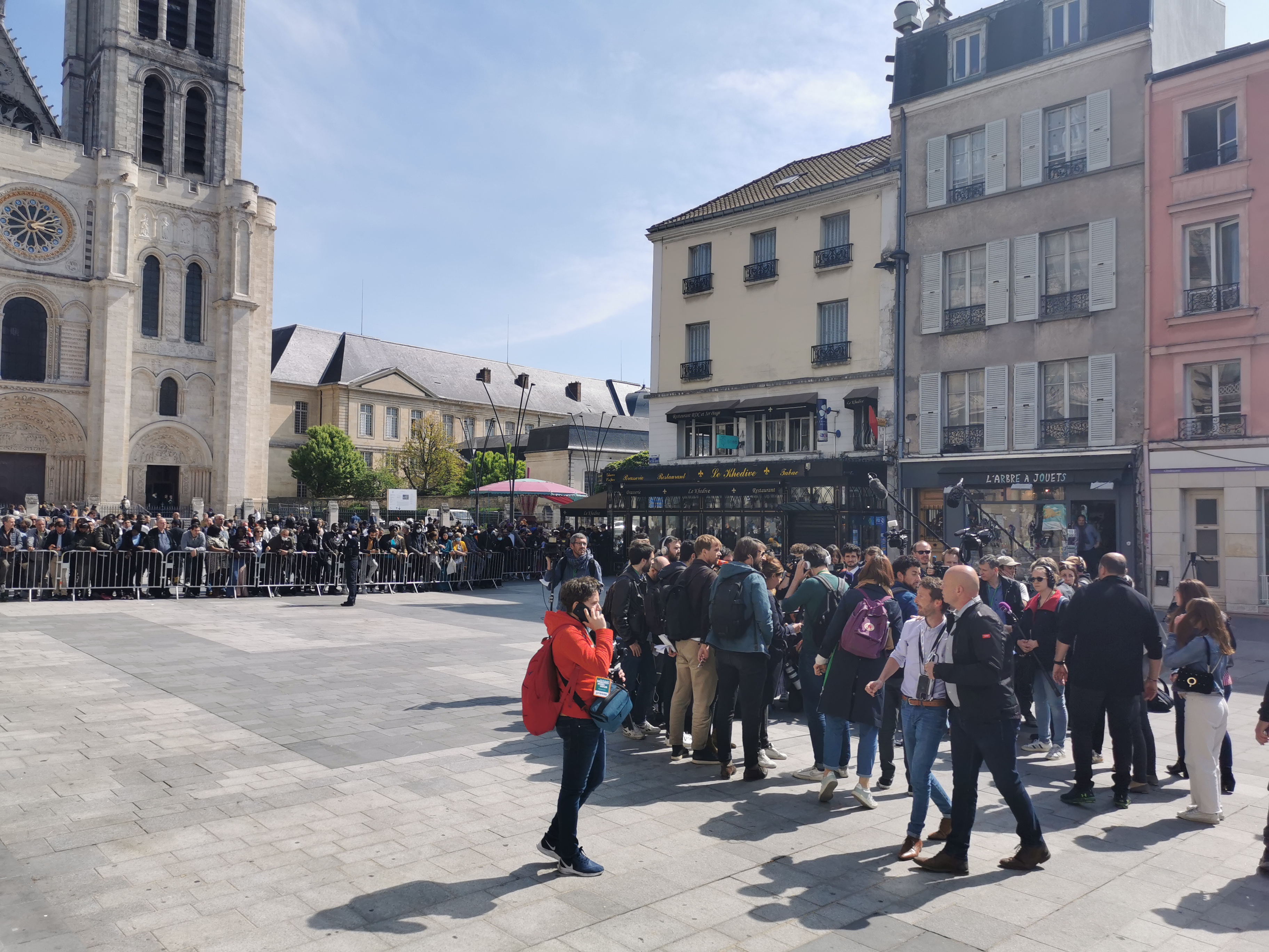 Dans une deuxième zone, à la barrière côté basilique, se massent passants curieux et journalistes accrédités. Derrière eux, la sécurité filtre les entrées autour de la basilique. Les journalistes – dont Arrêt sur images –