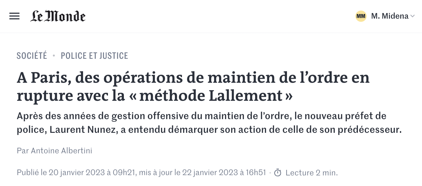 La préfecture de police de Paris a-t-elle changé son LBD d'épaule à propos de la gestion des manifestations ? C'est ce que défend un article du Monde publié le 20 janvier. "À Paris, des opérations de maintien de l'ordre en rupture avec la «méthode Lallement»", titre le quotidien. "Après des années de gestion offensive du maintien de l'ordre, le nouveau préfet de police, Laurent Nunez, a entendu démarquer son action de celle de son prédécesseur", écrit le journaliste Antoine Albertini – joint par Arrêt sur images, il n'a pas souhaité s'exprimer. Au lendemain de la première manifestation d'ampleur contre la réforme des retraites, le journaliste fait un bilan positif de la tactique mise en place à Paris par les forces de l'ordre, à rebours des méthodes jugées plus agressives de Didier Lallement, préfet de 2019 à 2022. Un discours qui n'a pas du tout convaincu Paul Rocher, auteur de Que fait la police ? et de Gazer, mutiler, soumettre - Politique de l'arme non létale aux éditions de la Fabrique, qui s'en est ému sur Twitter et a répondu à ASI.