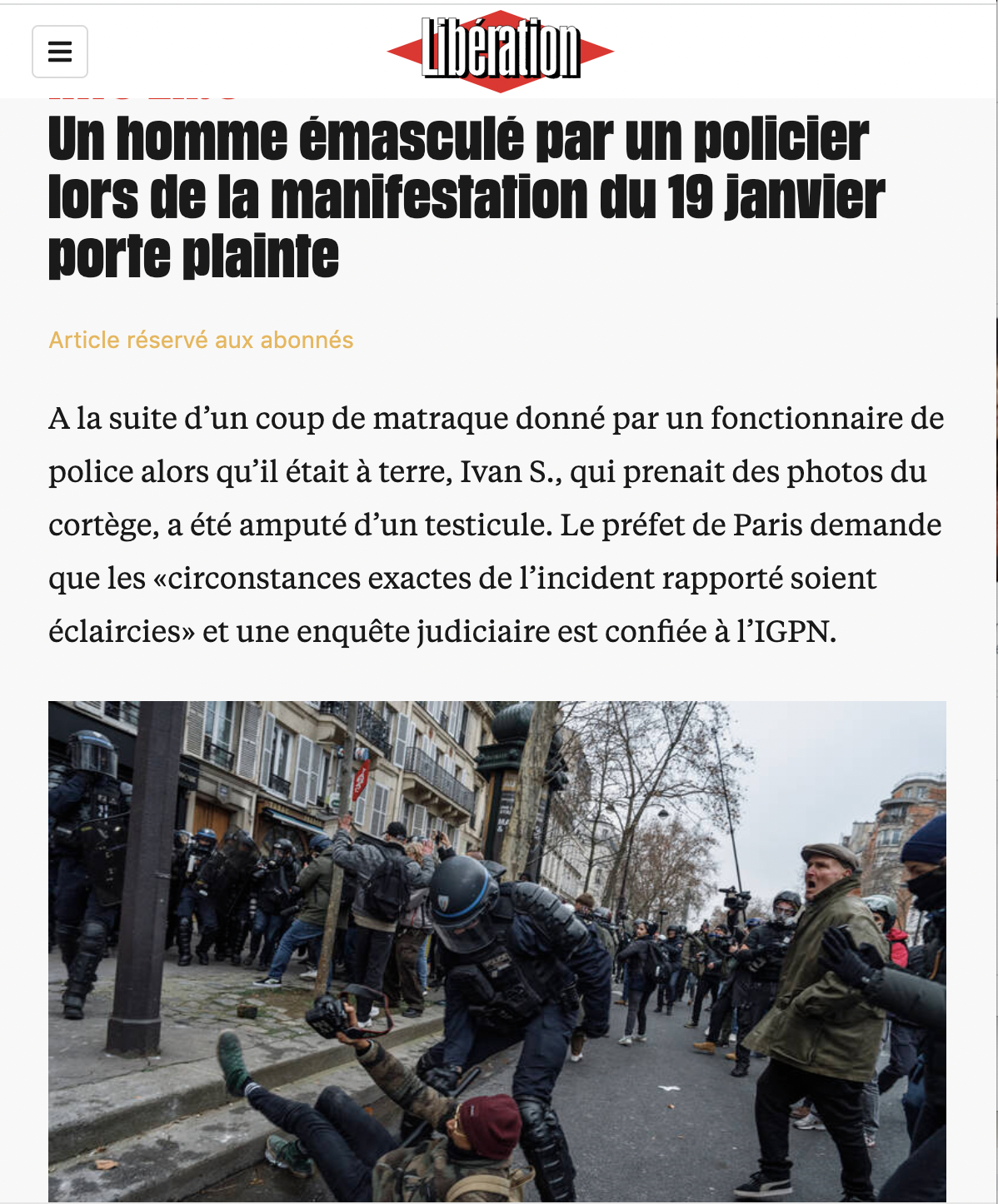 Mais aucun incident "grave" n'avait été indiqué le 19 janvier par la préfecture, ce qui faisait écrire au journaliste, dans l'édition papier du quotidien : "Alors que la journée était annoncée à haut risque, le bilan de la Préfecture de police de Paris faisait état, jeudi soir, d'un total de 44 interpellations pour port d'arme prohibé, outrage et rébellion, jets de projectiles ou dégradation, et de quatre blessés légers parmi les forces de l'ordre. Sans aucun incident majeur." Sauf que le 22 janvier, trois jours après la manifestation, Libération révélait qu'un jeune homme de 26 ans avait porté plainte après avoir été amputé d'un testicule, suite à un coup de matraque donné par un fonctionnaire de police.