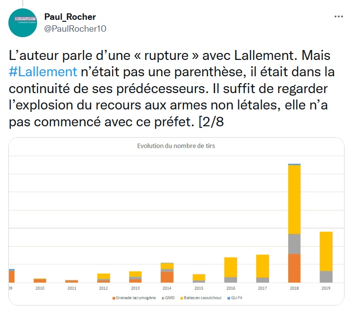 L'article du Monde suggère que l'ère Lallement a été un épisode inédit, en rupture avec ses prédécesseurs et ses successeurs. "Après trois ans et demi d'une approche très offensive de cette question par son prédécesseur, Didier Lallement, [Laurent Nunez] entendait s'en démarquer en opérant un retour aux fondamentaux de la stratégie française en la matière, fondée sur la dissuasion autant que sur la manœuvre", écrit ainsi le Monde. "De nombreux indices montrent que la période Lallement ne correspond pas à une parenthèse, oppose Paul Rocher. J'ai montré dans mes livres que Lallement n'est pas le point de départ de l'explosion des violences policières, notamment dans le cadre des manifestations, mais qu'il s'inscrit lui-même dans le cadre d'une accélération de ces violences qui préexistaient déjà." Rocher a notamment partagé en ligne un graphique de sa conception, basée sur les données de l'IGPN, montrant l'utilisation des armes non létales depuis 2009.