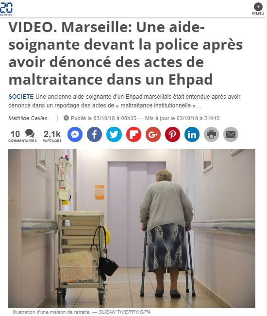 Une aide-soignante, entendue par la police, une autre, virée par sa maison de retraite… Leur tort ? Avoir dénoncé à la télé les actes de maltraitance dont elles ont été témoins dans leur Ehpad (Etablissements d'hébergement pour personnes âgées dépendantes). Comme le raconte 20 minutes, la Sûreté départementale de Marseille a convoqué en début de semaine Isma Mehtougui. Cette ancienne aide-soignante d’une maison de retraite du groupe Korian fait l’objet d’une plainte contre X pour recel, abus de confiance et atteinte à la vie privée, déposée par son ex-employeur.