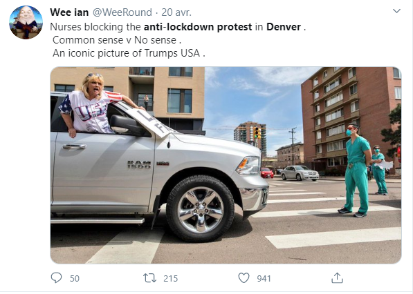 Les images ont fait le tour des réseaux sociaux. On y voit deux personnes habillées en soignants, portant blouse, masque et lunettes, qui barrent la route à des automobilistes surexcités. À l'avant d'un SUV gris, une femme vêtue des couleurs du drapeau américain les invective. "Allez en Chine si vous voulez le communisme ! Vous allez travailler, pourquoi je ne peux pas aller travailler ?