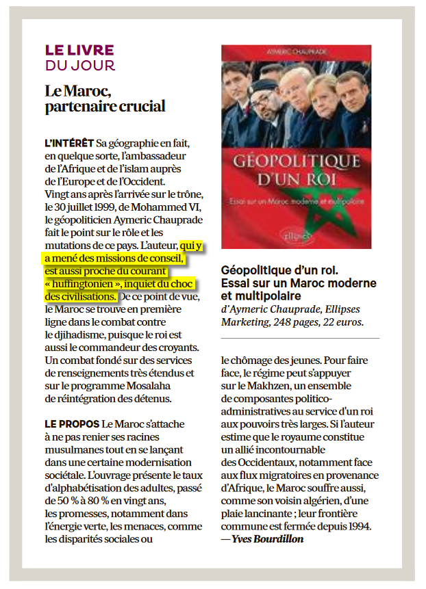 La bio était sans doute trop courte pour être honnête. Les Échos de ce jeudi 12 septembre font de Géopolitique d'un roi, un essai sur le Maroc de Mohammed VI, leur "livre du jour". L'auteur de cet essai ? Un certain Aymeric Chauprade, "géopoliticien". De lui, on apprend au détour d'une ligne qu'il a "mené des missions de conseil" au Maroc et qu'il est "proche du courant "huffingtonien", inquiet du choc des civilisations." [En fait "huntingtonien"]. Pour le reste, Les Échos