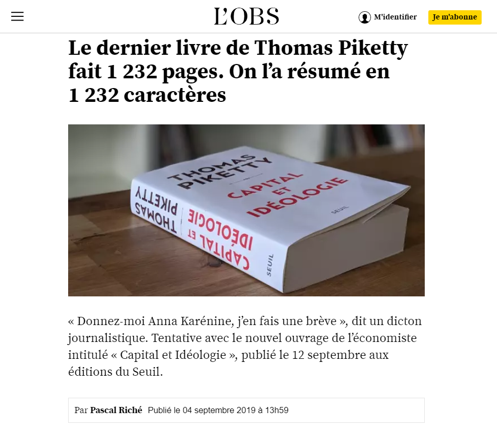 Mais gloser sur le nombre de pages et de ventes des livres n’exonère pas complètement d’aborder le fond. Si Piketty s’attache à étudier "l'histoire des systèmes de justification de l'inégalité", ce sont surtout les propositions du chapitre "Éléments pour un socialisme participatif au XXIe siècle"