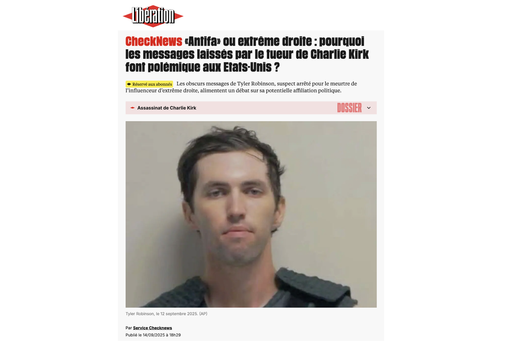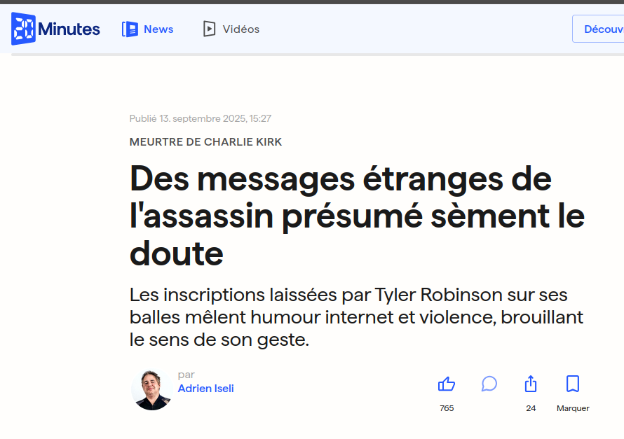 Ces "formules cryptiques" (TF1), ces "messages étranges" (20 Minutes), ces "inscriptions énigmatiques" (Ouest-France) sont disséqués, analysés, décortiqués, avec un mélange de perplexité et de stupéfaction. Rapidement, la presse états-unienne (conservatrice comme libérale), notre bonne vieille presse Bolloré et même l'AFP parviennent à un consensus : Tyler Robinson, "radicalisé politiquement", a laissé des messages "antifascistes" (qui, selon Fox News, "éclairent les motivations de l'auteur"), et son acte devient indéniablement un "attentat d'extrême-gauche". Trump et son administration, qui décrivent Robinson comme un "gauchiste radical", approuvent. Le Wall Street Journal plonge tête la première et affirme, sans preuve, que Robinson adhère à "une idéologie transgenre et antifasciste", avant de se rétracter face aux faits.