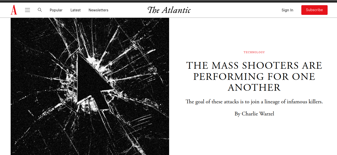 Au fil des années, une véritable aesthetic de la violence s'est installée, niche, argotique, imperméable au grand public. En 2025, dans certaines sphères numériques étanches au regard journalistique généraliste, la tuerie de masse est un contenu parmi d'autres, une monnaie d'échange de la réputation en ligne. L'année précédente, l'anthropologue des communautés en ligne Katherine Dee réalisait sur Tablet que les admirateurs de tueurs de masse forment un fandom, une sous-culture parmi d'autres, qui fonctionnent exactement de la même manière que le fandom d'Harry Potter ou de Star Wars. Dans ces autels, un massacre s'évalue comme un produit culturel et un terroriste est un influenceur comme un autre, avec qui d'aucuns créent des relations parasociales. Un mouvement, le True Crime Community (TCC), qui compterait plus de 70 000 membres et est classé comme organisation terroriste en Russie, voue un véritable culte à "Eric" (Harris) et "Dylan" (Klebold), les meurtriers de Columbine en 1999, événement matriciel de "l'extrémisme nihiliste violent" (nihilist violent extremism, NVE) devenu, au fil des distorsions collectives, un véritable mythe, fait de revanche sociale et de violences scolaires, pour des légions de "Columbiners".