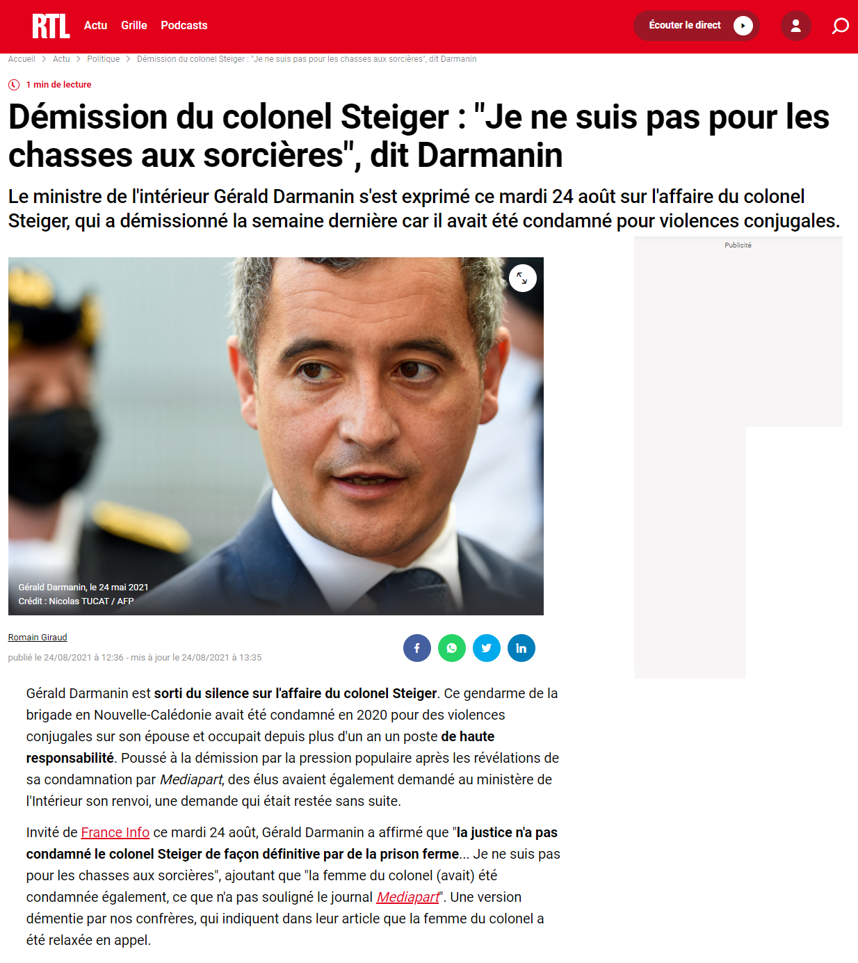 ? Gérald Darmanin n'a pas l'air très sûr, alors il joue sur les mots. Le 24 août au matin, le ministre de l'Intérieur était invité dans la matinale de Franceinfo pour réagir à la démission du colonel Eric Steiger, gendarme promu en Nouvelle-Calédonie qui s'est vu forcé de quitter ses fonctions après les révélations de Mediapart,