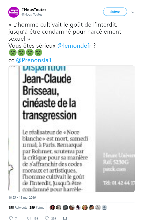 C’est un tweet féministe qui a attiré notre attention dans les jours qui ont suivi le décès du cinéaste Jean-Claude Brisseau. Un tweet énervé, qui brocardait l’accroche de Une du Monde