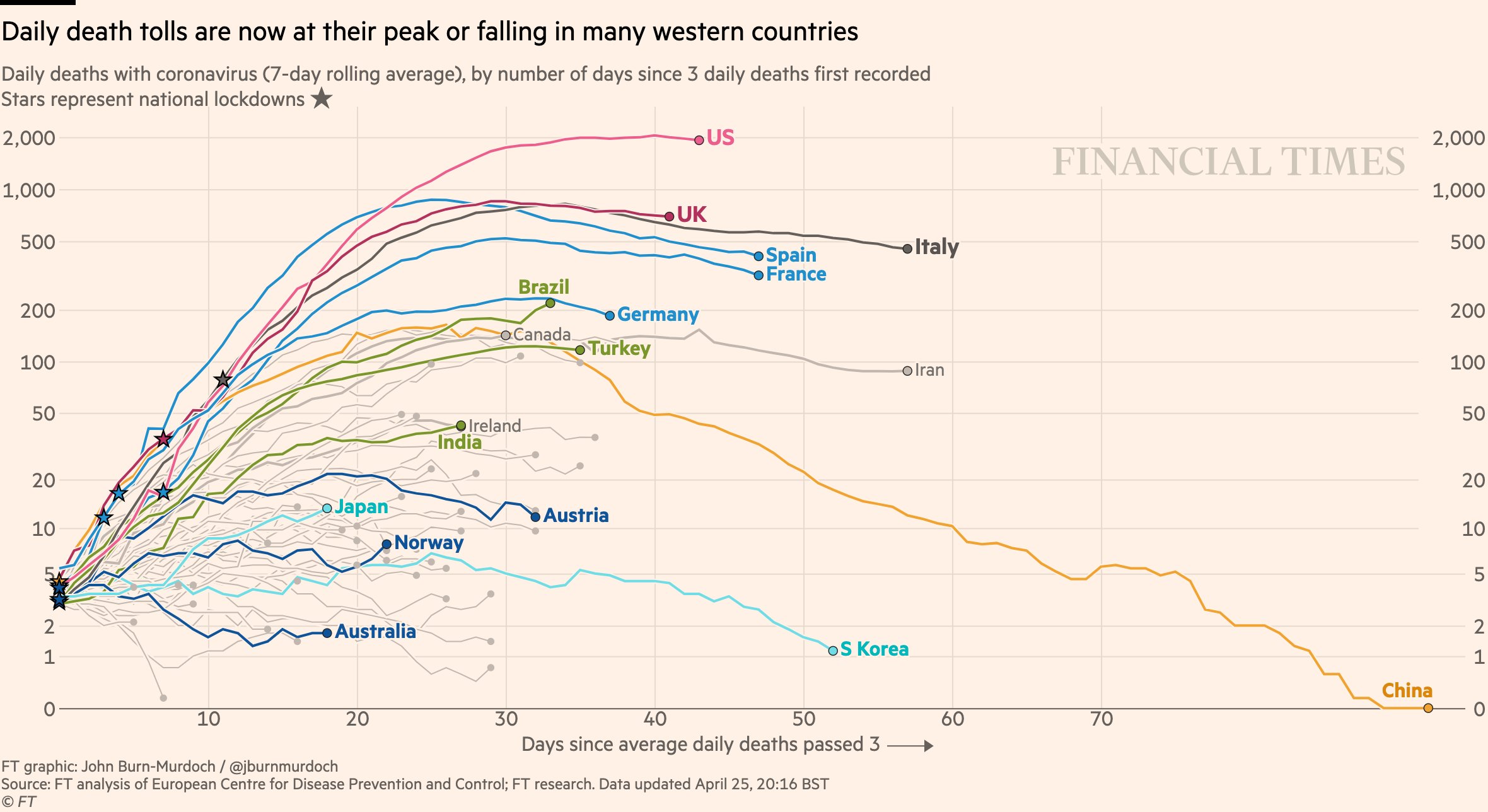 Dans une interview du 14 avril, Burn-Murdoch explique : "Vers le 10 mars, un de nos journalistes voulait savoir où en étaient l’Espagne et le Royaume-Uni par rapport à l’Italie", note Burn-Murdoch. Le journaliste fait alors le choix déterminant d’une progression dite "logarithmique" (et non plus linéaire). Il crée deux courbes, du nombre de cas d'abord, du nombre de morts cumulé ensuite (qu'il transformera en avril en nombre de morts quotidiennes). Actualisées chaque jour sur une page placée en accès libre par ce média 100 % payant en temps normal, elles deviendront les infographies les plus citées au monde.
